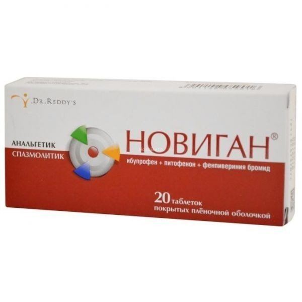 Активные вещества: ибупрофен 400 мг, питофенона гидрохлорид 5 мг, фенпивериния бромид 0,1 мг.