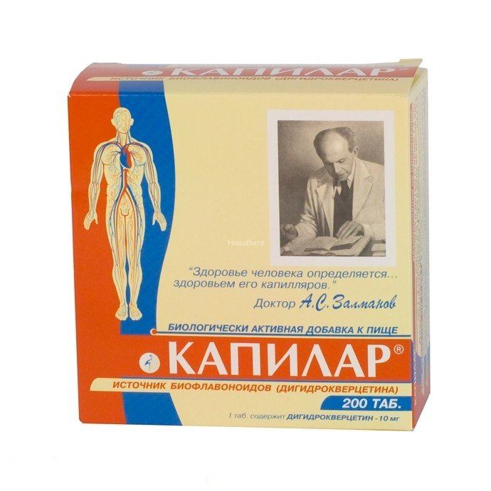 Капилар - биологически активная добавка к пище, изготовленная из сибирской лиственницы, действующим началом которой является биофлавоноид дигидрокверцетин. Это сильный антиоксидант, действие которого выше, чем у витаминов А, С и Е. Обладает сосудорегулирующим действием на всю сосудистую систему: артерии, вены, капилляры. Способствует улучшению кровотока и уменьшению отёков за счет снижения вязкости крови и проницаемости сосудистой стенки.