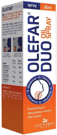 Olefar DUO Oil Spray содержит комбинацию природных масел растительного происхождения, в виде спрея для горла.